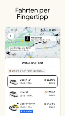 Mit Uber wird Ihre Mobilität in der Stadt mühelos neu definiert. Erleben Sie eine nahtlose und komfortable Art, von A nach B zu gelangen, maßgeschneidert für jede Lebenslage und jedes Bedürfnis. Die Uber App präsentiert Ihnen eine beeindruckende Palette an Fahroptionen: Vom kostengünstigen UberX für Ihre Solofahrten bis zum geräumigen UberXL für Gruppen bis zu sechs Personen. Für umweltbewusste Reisende stehen Uber Electric und Uber Comfort Electric mit modernsten Elektrofahrzeugen bereit. Gönnen Sie sich Luxus mit Uber Comfort, das Ihnen viel Beinfreiheit in hochwertigen Autos bietet, oder nehmen Sie Ihren vierbeinigen Freund mit Uber Pet einfach mit. Zudem ermöglicht die Integration von Uber Taxi den Zugriff auf lokale Taxis zu regulären Tarifen, ergänzt durch Spezialoptionen wie Uber Taxi Wheelchair für Rollstuhlfahrer*innen und Uber Assist für Menschen mit eingeschränkter Mobilität. Bereits vor der Buchung erhalten Sie eine transparente Fahrpreisschätzung, damit Sie stets die volle Kostenkontrolle haben.